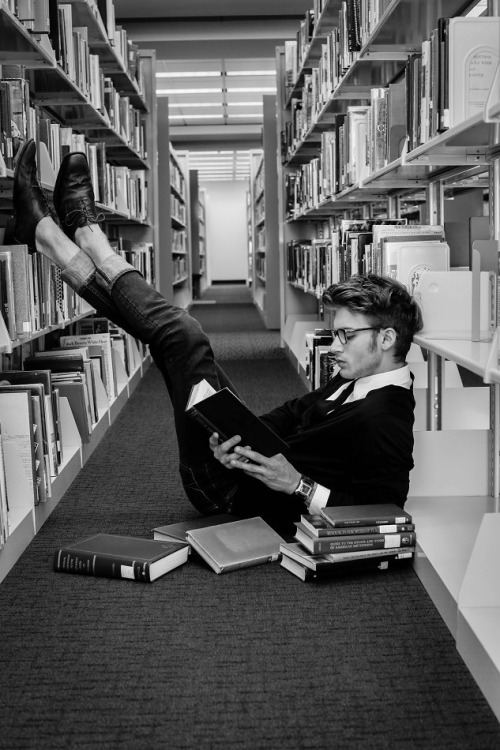 Then I see this stranger dude lying across the walkway through the stacks with a few piles of books around him. He looks like some little Sartre wannabe. No matter. He’s cute enough. He’ll do for me right now. I walk up to him, look down, and say, “Hey, I have something to show you. Mind following me for a minute? You won’t be sorry..”