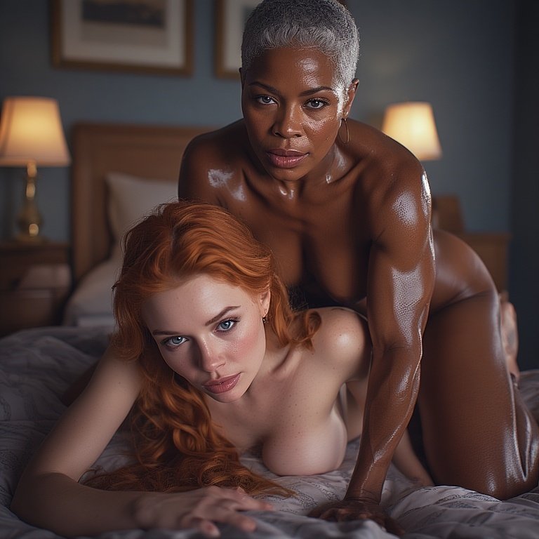 Evelyn’s body responded instinctively, her hands rising to tangle in the black woman’s grey, close-cropped hair, her fingers digging into her scalp to hold her in place. She met Lathifa’s demanding, possessive kiss with a fervor that surprised even herself, her body arching into the older woman’s touch, her heart pounding wildly in her chest. The black woman’s grip on the white girl’s body grew stronger, her touch both demanding and supportive. The beautiful redhead’s breath catches as she feels the older woman’s grip tighten, her body being guided and maneuvered, her resistance futile against the older woman’s strength and resolve. With firm pressure, Lathifa pushes Evelyn’s mouth toward her black breast, her voice a low, commanding growl in Evelyn’s ear.