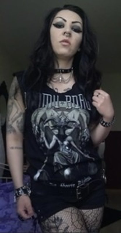 She had dark eyes, dark hair, piercings and tattoos and was wearing black shorts over black fishnets and a black t-shirt with some kind of death metal band design on it. A sexy Goth girl without a smile, always one of my favourites.