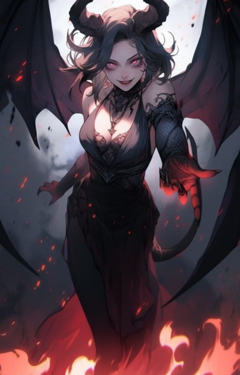 A young horned woman clad in black spreads her arms as dark wings extend from her back. Her hefty chest is barely bound in place by black leather straps as she starts sauntering towards me. Meanwhile, her bottom is covered by black lace panties with a heart-shaped cutout exposing her already dripping slit.