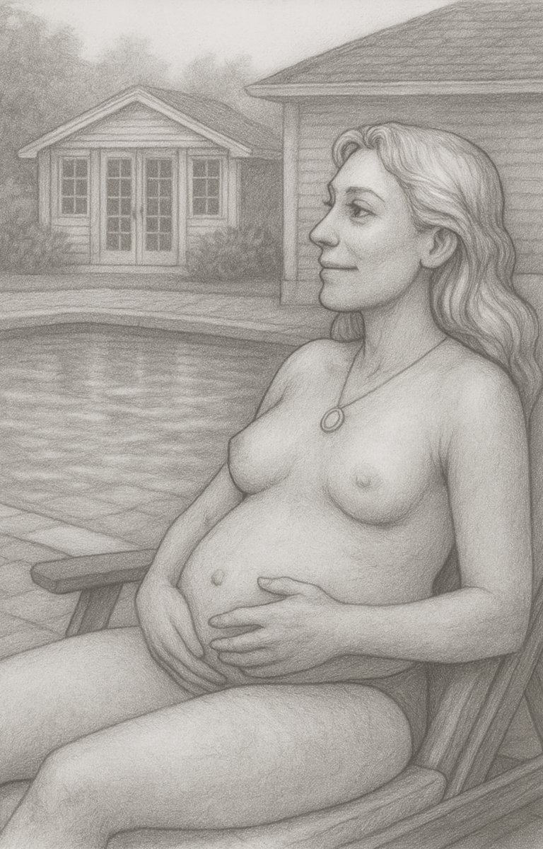 She leans back onto her elbows, opening herself for me. Her baby bump bulges over her petite frame. Her belly button’s popped. Pink stretch marks rise in harsh lines above the familiar blonde patch between her legs.