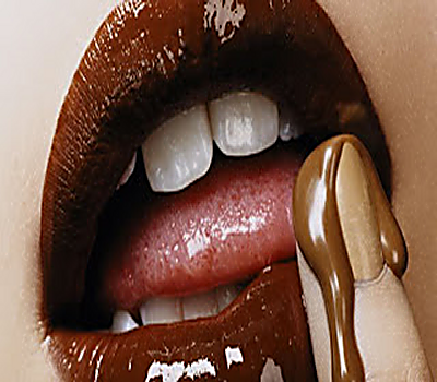 The sight of him lying there covered in chocolate makes me want to pounce him. I place the bowl back down, and scoot down lower. I kiss right below his belly button before taking the tip of my tongue, and run it slowly upwards. The contact of his flesh and chocolate mixes so perfectly I can’t help but moan out. His breathing becomes a bit quicker, his cock harder by the second, and he moans out for me. Each of his nipples has a nice layer of chocolate on them; I lean up to his right one and flick my tongue against it.