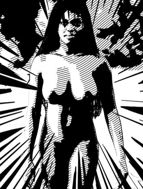 Large breasts and she kept stretching the film as she stepped forward, until it shattered into an image with a grey figure at the center and radiating spikes pointed inward. She was a shattered image. Like a picture painted on glass in black, then broken. As she stepped forward and started to change, I could see her more clearly and calmed a little.