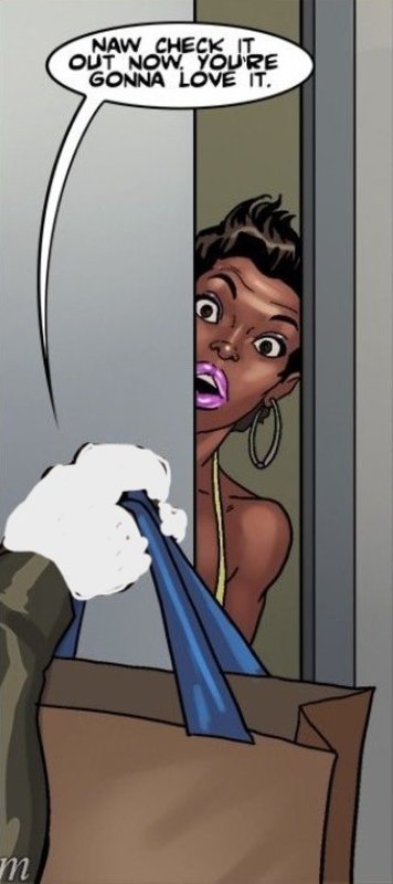 We went to the mall and I bought her some clothes at JC Penny’s. Two pairs of short denim shorts that were tight around her amble butt and one pair were so short that her butt cheeks hung out a little. One pair was blue denim and the shorter pair was black denim. I also bought her some low-cut tops that gave her big, black tits noticeable cleavage.