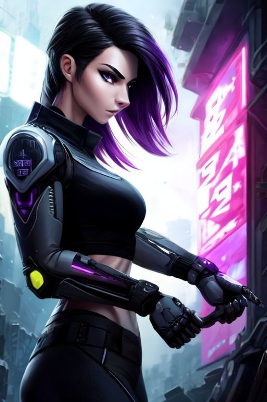 Mia straddled him on the couch, her raven black hair with purple tips creating a dark frame around their faces. Her purple cybernetic eyes, gleaming with the soft glow of the room’s ambient lighting, searched Takeshi’s gaze, looking for the truth beneath his stoic facade. She knew he was worried, could see it in the tightness of his jaw and the way his hand trembled slightly on her thigh.