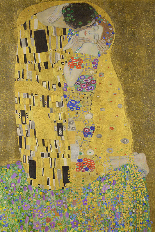 The Kiss (1907) is an oil-on-canvas painting by the Austrian painter Gustav Klimt. The Kiss depicts an embracing couple kneeling in a grassy patch of wildflowers. As she wraps her arms around her partner’s neck, her eyes are peacefully closed, emphasizing the tranquility and intimacy of the scene.