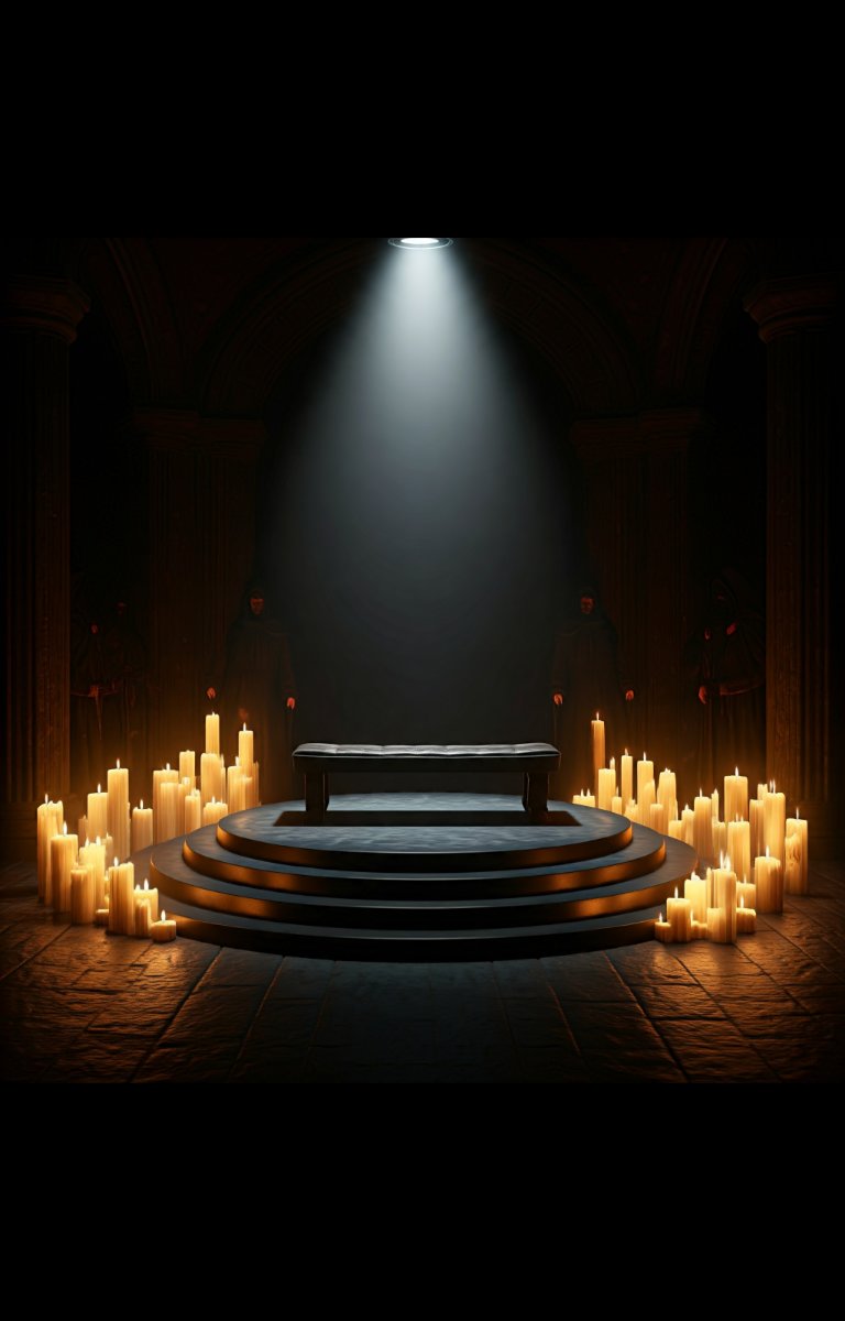 Ashley knelt in the center of the grand chamber, her body calm but her mind buzzing with anticipation. The dimly lit room was vast and shadowed, save for a single, soft glow that illuminated a low, leather-bound bench placed on a small dais ahead. Its surface gleamed in the light, inviting and mysterious, a focal point for what was to come.