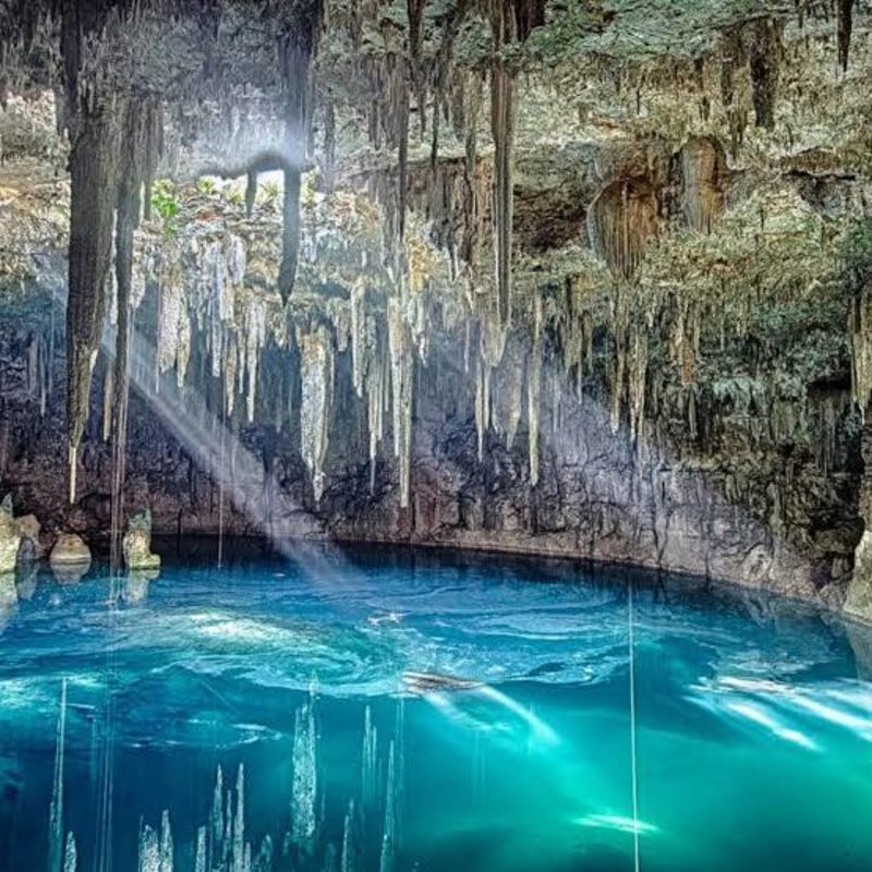 Inside the well, the sunlight illuminates a polished stone altar on a small beach. Next to it are two figures with ritual paintings for the offerings.