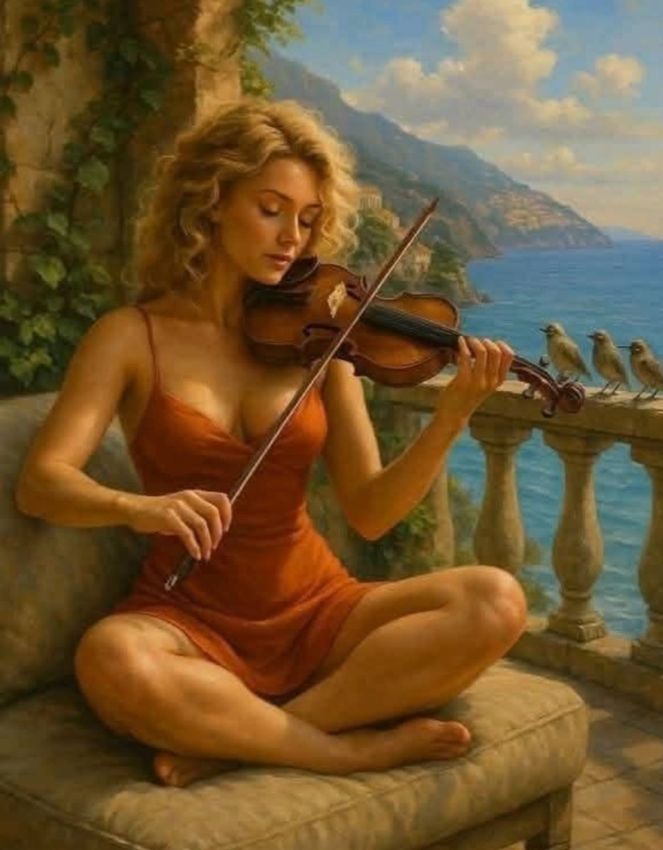 Hans woke up the next morning in his bed. The painting of Cathrine sat on the easel, almost completed. She was wearing a red slip, sitting cross-legged in a chair on his balcony, looking over the lake. She was playing the violin, and you could almost hear her playing. Hans studied his work. It was by far his best work. Hans’s cock was hard.