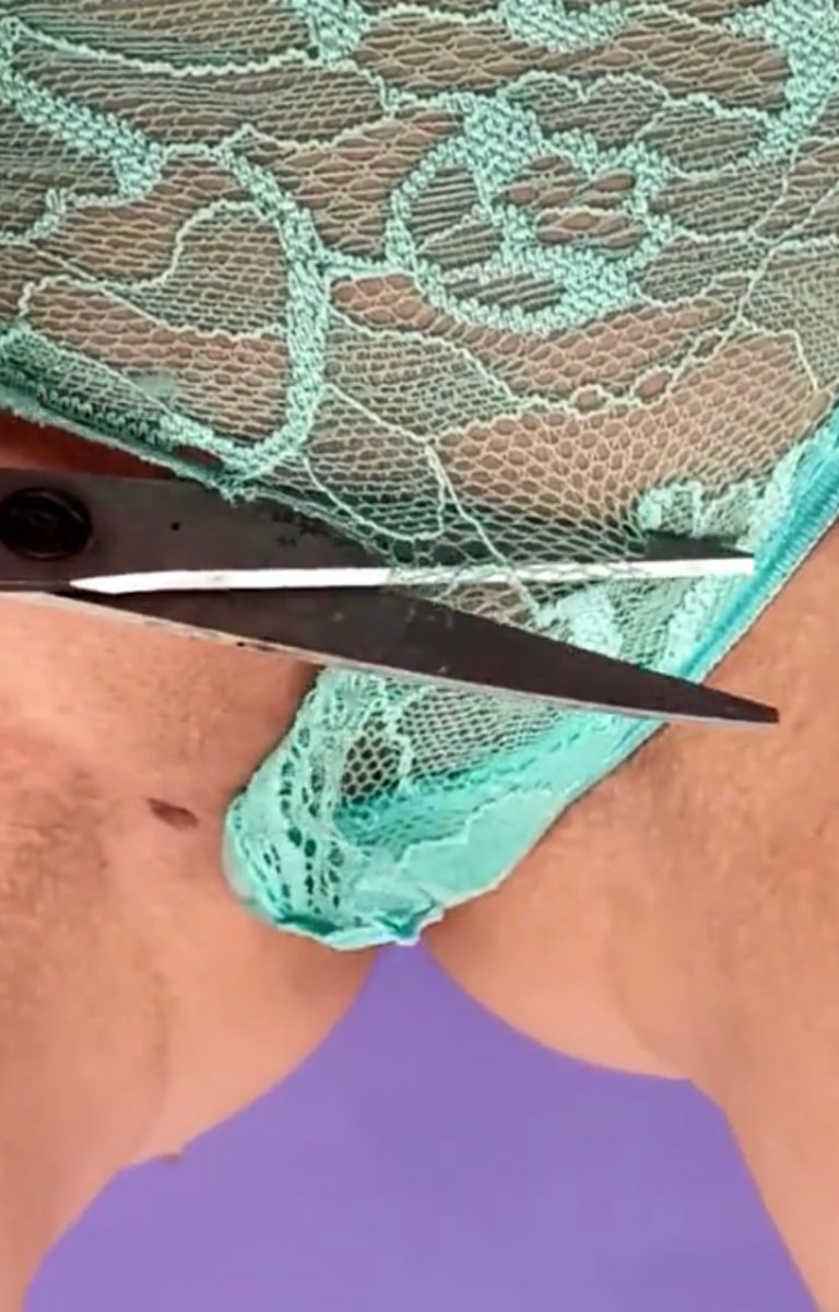 You are somewhat alarmed when she proceeds to cut a slit in the crotch from the back to the front.