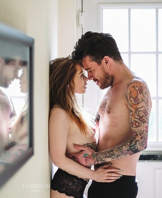He tenderly touched my lower back, overwhelmed by passion, before breaking the kiss and quickly pulling up my T-shirt. I willingly raised my arms, letting him remove it entirely, and we shared another passionate kiss.