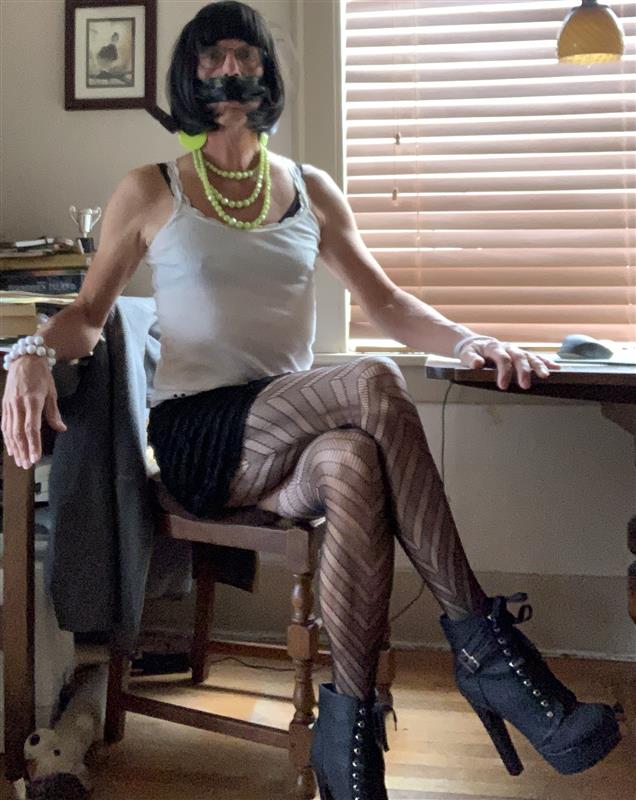 “Come here,” I said as I stood and embraced her again. Then I took a short step to my left, and into the combination bathtub/shower stall. I held her as I backed into the tub, and gave her one last kiss. I let her go and stood up straight. I was still wearing all the clothing that she’d put on me, and my wig, and as she stood facing me, she slowly opened her eyes. I could feel my dick going limp with embarrassment, but at least that meant that I could maybe pee now. I slid my hand under the hem of my wet chemise, into my sopping panties, and pulled my dick and balls out. I rubbed her pee into my crotch, and before I could get too hard, I tried to piss.