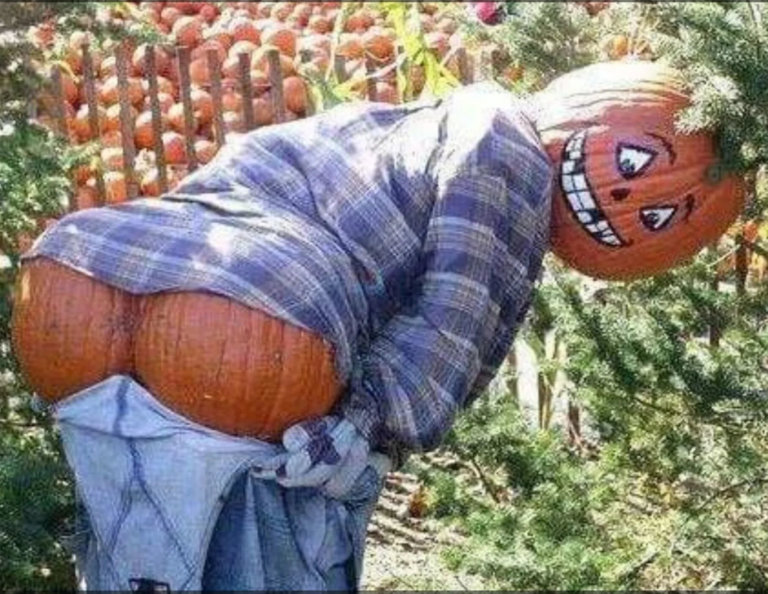 A content smile—until I see the orange carved fruit, backside sprayed with congealed white streaks above a hole labeled ‘insert hallow-weenie here’.