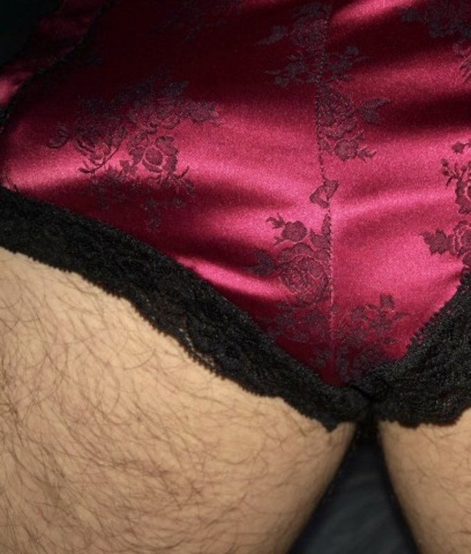 I didn’t need any further encouragement and slipped off my mini trunks, pulling the red silky panties over my growing cock. They were a bit big for me too, and I’m only slightly larger than her. Curiously I rather liked the extra material, it made room for my swollen balls and stiffening cock, at the same time allowing a puffiness around my arse and between my legs which enhanced the feeling of vulnerability.