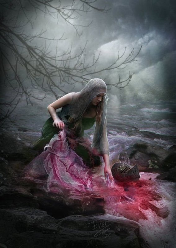As they clattered over the bridge, Catherine glanced down at the stream that marked the boundary of the estate. She saw a woman wearing a long grey cloak washing a blood-stained shirt in the water. The woman glanced up as the carriage passed and Catherine found herself staring into the greenest pair of eyes she had ever seen. The woman had a mass of red curls which framed a pale drawn face. They locked eyes for only a second before the woman bowed her head again and continued with her washing. Catherine wondered what had happened to create so much blood as the water around the woman was a vivid red.