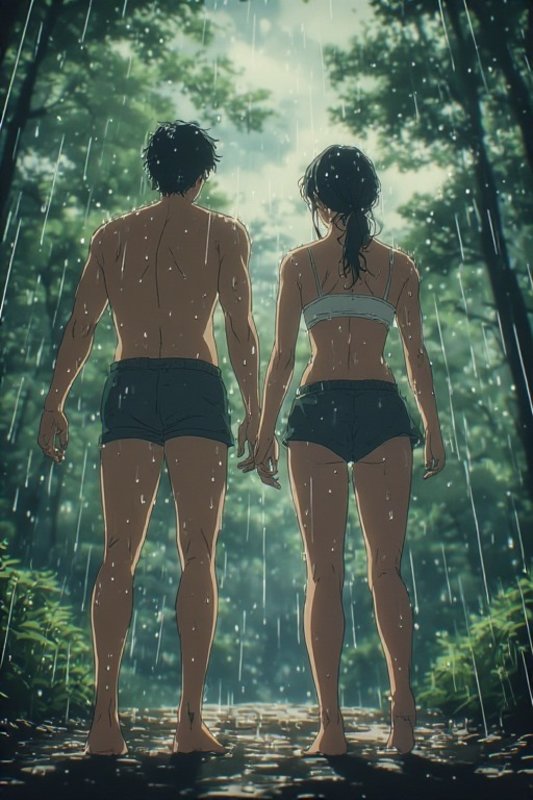 A sudden crackle of thunder stops our laughter and makes us both jump. I then walk towards the entrance of the cave. It’s still pouring rain. I sigh out loud. “Well, I guess we’re stuck in here for the time being. And there’s no point in setting our clothes outside to dry.”