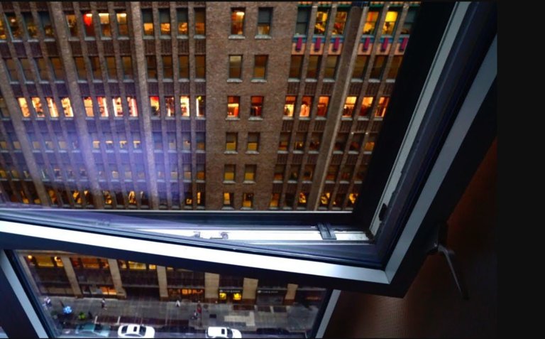Immediately the sounds of the city flooded the room. We were only a few floors up – street chatter, taxis honking. I looked down out of the corner of my eye as I sucked his long cock and wondered if I might be about to be thrown out or what.