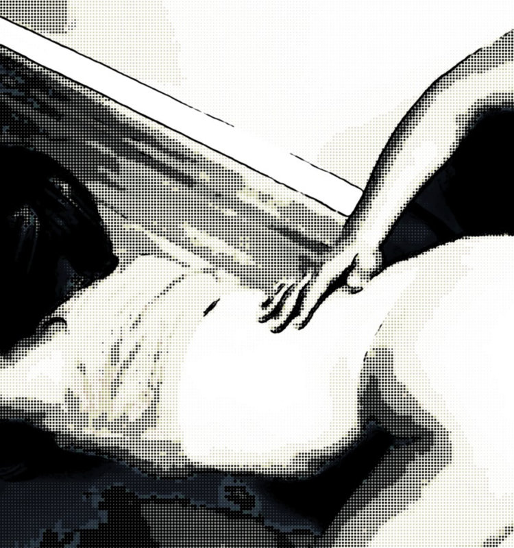 I move us to the window ledge that overlooks the city. I sit next to you, our knees almost touching. I reach out and take your wrist in my fingers, holding it delicately yet firmly as I take your heart rate. Your heart beats quickly in your chest, torso heaving from labored breaths. It slowly calms as we sit there together, my eyes locked intently on your wrist as I count your heartbeats through my fingers.